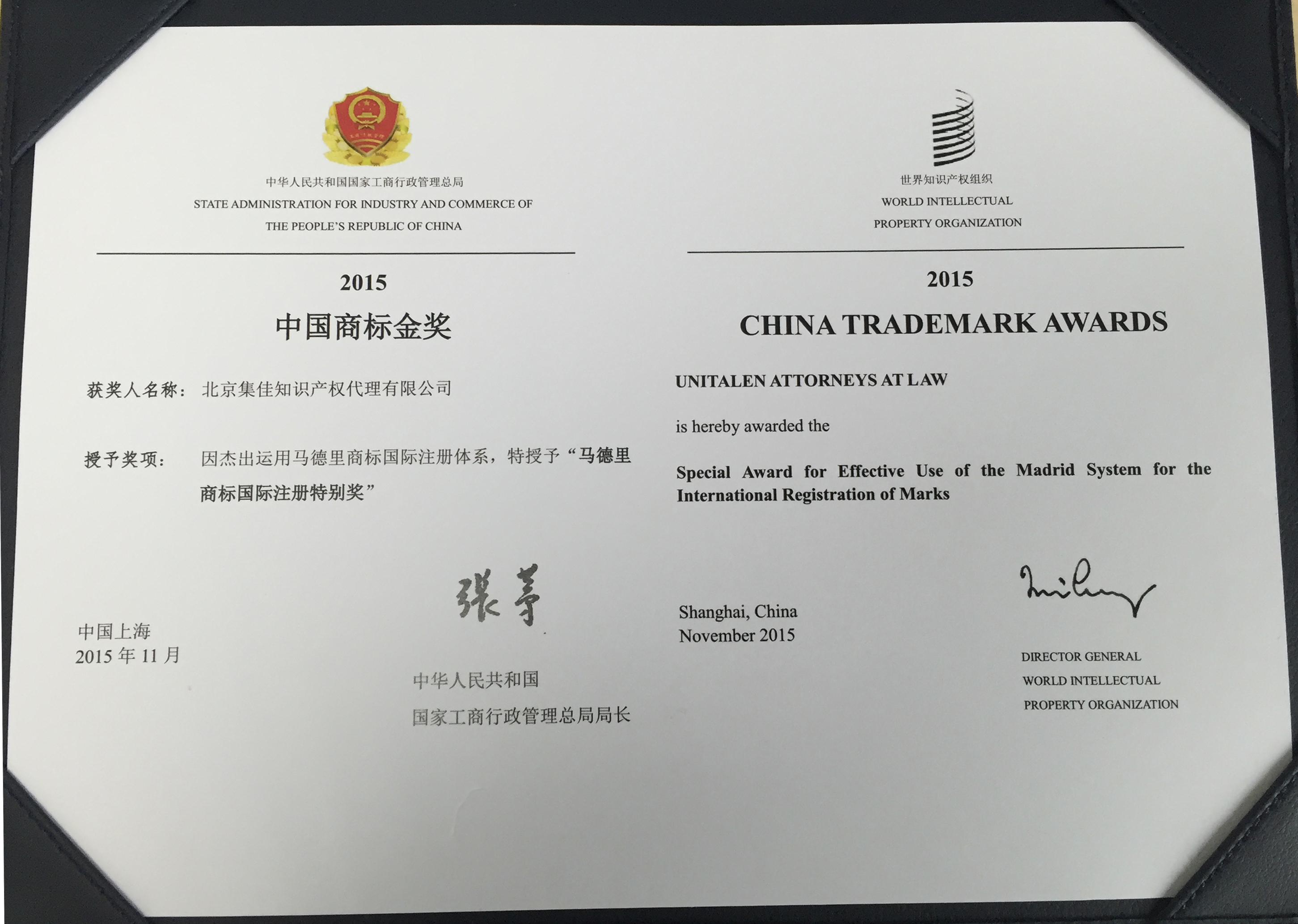于澤輝所長代表公司參加了此次表彰大會。因杰出運用馬德里商標國際注冊體系,國家工商總局和世界知識產權組織特授予集佳“馬德里商標國際注冊特別獎”。據悉,集佳是國內代理機構榮獲此獎項。