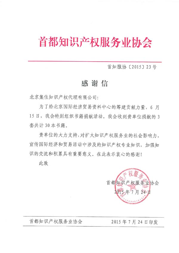 2015年7月24日,首都知識產(chǎn)權(quán)服務(wù)業(yè)協(xié)會向集佳發(fā)來感謝信。在其六月份組織的書籍捐獻(xiàn)活動中,集佳捐贈30本出自集佳專業(yè)人士的系列叢書《知識產(chǎn)權(quán)戰(zhàn)略與實務(wù)》,為北京國際經(jīng)濟貿(mào)易資料中心的籌建貢獻(xiàn)一份力量。