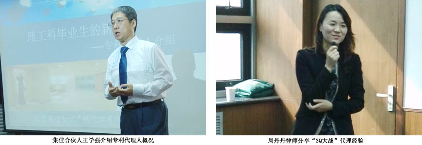 活動中,北京市代理人協(xié)會副會長、集佳合伙人王學(xué)強為同學(xué)們介紹了專利代理人的職業(yè)概況,使大家對知識產(chǎn)權(quán)和專利代理人行業(yè)有了更客觀的了解。知名代理律師周丹丹則與大家分享了“3Q大戰(zhàn)”的代理經(jīng)驗,充分展現(xiàn)了律師的代理風(fēng)采。宣講過程中,大家圍繞專利代理人的職業(yè)規(guī)劃和發(fā)展前景、律師在代理案件過程中總結(jié)的難點、解決方法和思路等問題與兩位專業(yè)人士進(jìn)行了熱烈討論。
