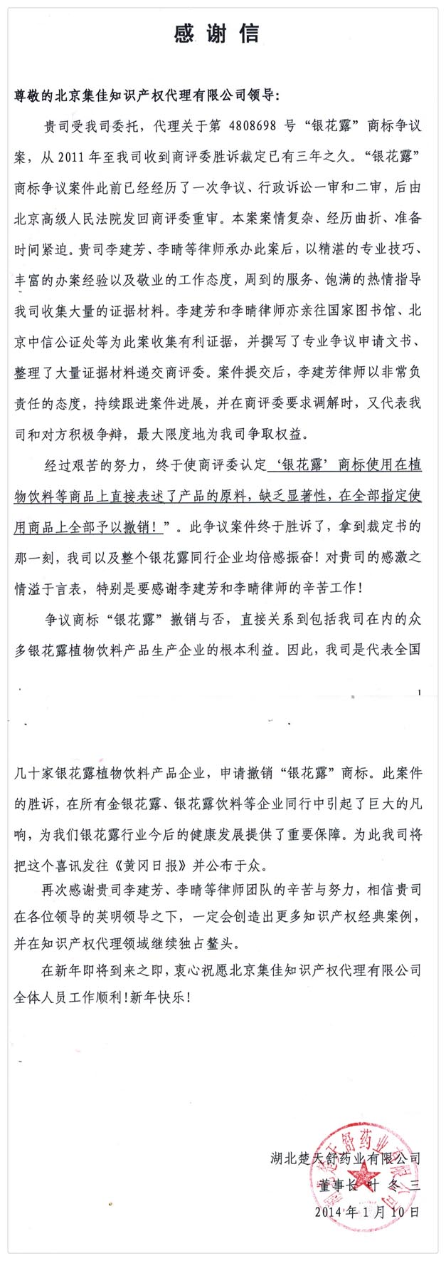 在新年即將到來之際,湖北楚天舒藥業有限公司給集佳發來感謝信,并提前祝福集佳全體人員新年快樂,工作順利。 集佳律師曾代理該公司第4808698 號"銀花露"商標爭議案獲得全面勝利。該案案情復雜、經歷曲折、準備時間緊迫,該案的勝訴,在所有金銀花露、銀花露飲料等企業同行中引起了巨大的凡響,為銀花露行業今后的健康發展提供了重要保障。