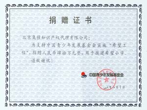 作為目前中國(guó)最大的知識(shí)產(chǎn)權(quán)服務(wù)機(jī)構(gòu)之一,集佳知識(shí)產(chǎn)權(quán)代理有限公司在自身穩(wěn)健發(fā)展的同時(shí),積極承擔(dān)著企業(yè)的社會(huì)責(zé)任。自2004年起,集佳與中國(guó)青少年發(fā)展基金會(huì)合作,積極參與“希望工程”捐建希望小學(xué)活動(dòng)。截至2009年10月,集佳已捐款一百五十余萬(wàn)元,援建了彪池村集佳希望小學(xué)、陸廟村集佳希望小學(xué)、韓營(yíng)村集佳希望小學(xué)、清風(fēng)嶺集佳希望小學(xué)和清泉集佳希望小學(xué),圓了近萬(wàn)名學(xué)齡兒童的求學(xué)夢(mèng)想。集佳正在用行動(dòng)兌現(xiàn)最初的承諾:“每年建一所集佳希望小學(xué)!”