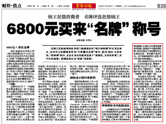 2007年4月5日,《京華時(shí)報(bào)》財(cái)經(jīng)焦點(diǎn)整版刊登了新聞:《鍋王忽悠消費(fèi)者 名牌評(píng)選忽悠鍋王 6800元買來(lái)“名牌”稱號(hào)》,各大媒體紛紛轉(zhuǎn)載報(bào)道。集佳律師事務(wù)所李永波律師接受了《京華時(shí)報(bào)》記者的采訪。