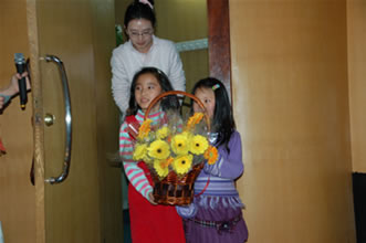 兩個(gè)可愛(ài)的小朋友獻(xiàn)花給米春梅阿姨表示祝福和感謝