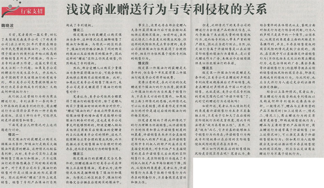 集佳代理人撰文《淺議商業贈送行為與專利侵權的關系》在《中國知識產權報》發表