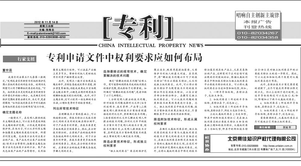 《中國(guó)知識(shí)產(chǎn)權(quán)報(bào)》:專(zhuān)利申請(qǐng)文件中權(quán)利要求應(yīng)如何布局