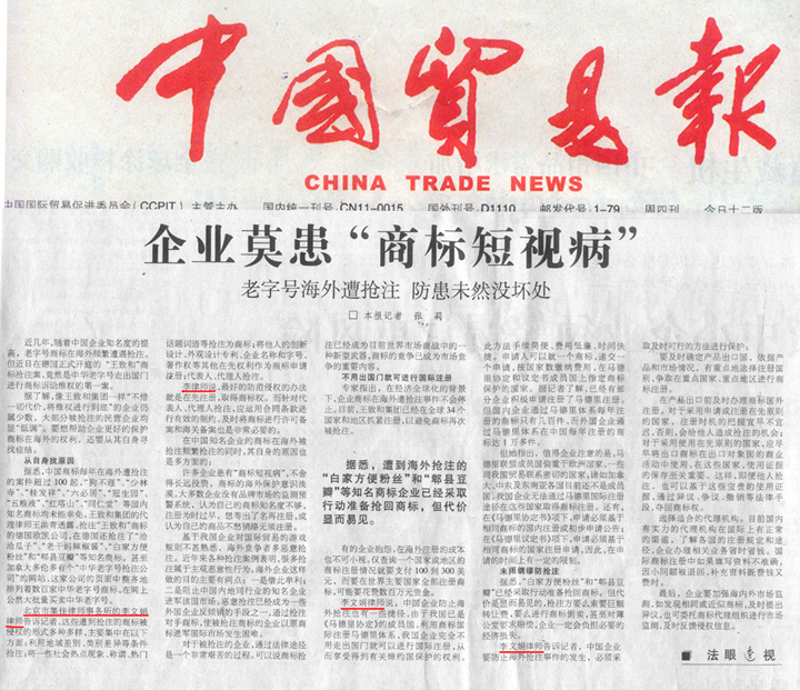 《中國貿易報》采訪:《企業莫患“商標短視病” 老字號海外遭搶注 防患未然沒壞處》