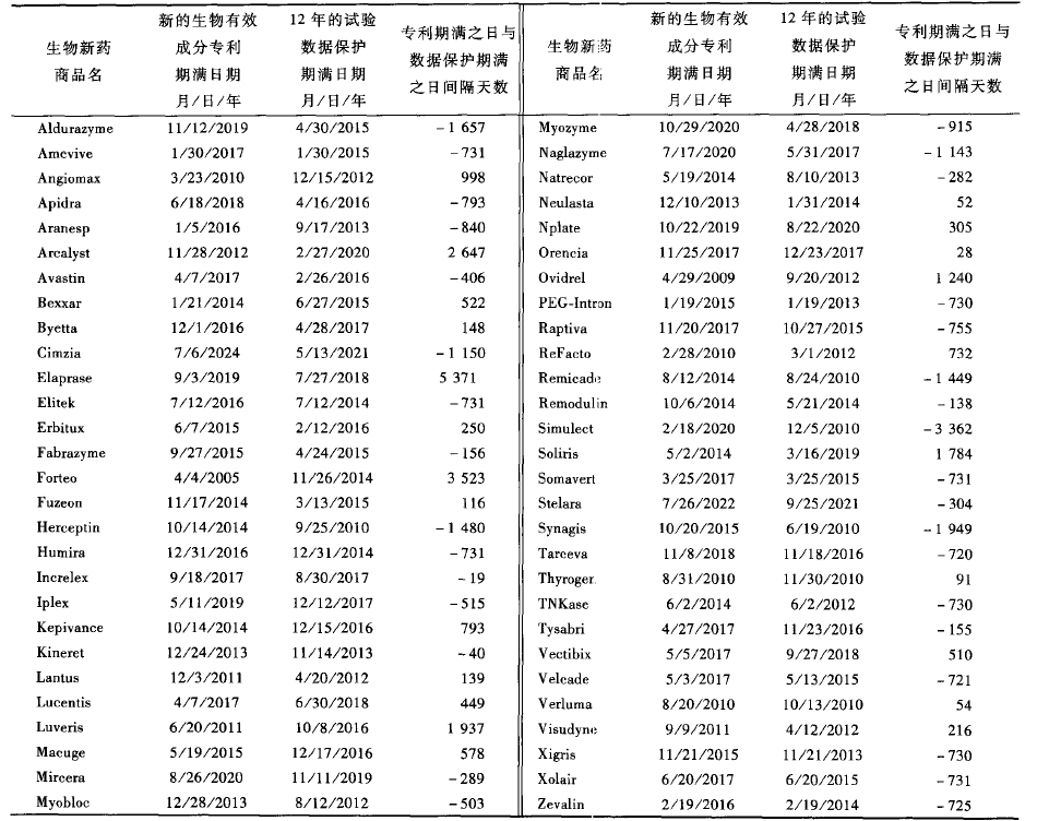 藥品數據保護制度,尤其是藥品數據獨占權模式的藥品數據保護制度,能夠顯著地彌補專利及其他保護形式的不足,推遲仿制藥的上市,為原研藥繼續保持合法的市場壟斷地位。眾所周知,專利保護對于原研藥而言是絕對的生命線,但是隨著研發新藥的難度和投資成本越來越大,研發周期越來越長,始終保持不變的20年專利保護期(對于大多數國家而言)就越來越起到推動原研藥廠商開發新藥的作用,數據保護制度的出現在一定程度上解決了這一矛盾。有研究人員對2010年3月美國《生物技術制品價格競爭與創新法》(Biologics Price Competition and Innovation Act,BPCIA)頒布后能夠享受數據保護的56個生物新藥進行了研究,其中有接近一半的藥物在專利過期后仍然能享受數據保護所賦予的市場壟斷地位(見下表),其中最長的接近十年7。