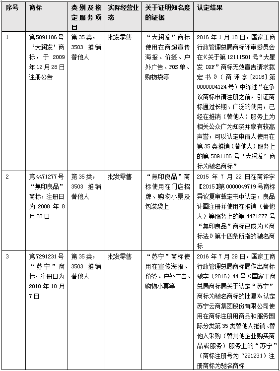 另外,即使在商標授權確權程序中,對一些案件的裁判結果與固有的“批發零售和推銷替他人不相同不類似”認知也相左,以下列舉“大潤發”、“無印良品”和“蘇寧”三個行政認定馳名商標案件為例予以說明。“大潤發”是知名的連鎖超市品牌,其權利人在2009年12月在第35類第3503類似群“推銷(替他人)”服務項目上注冊第5091186號“大潤發”商標,后在批發零售業態上進行了大量使用,2015年基于在批發零售上使用形成的知名度,第5091186號“大潤發”商標被認定為上海市著名商標,2016年該商標被原國家工商總局商評委認定為馳名商標。除此之外,類似情形的還有無印良品和蘇寧兩案。