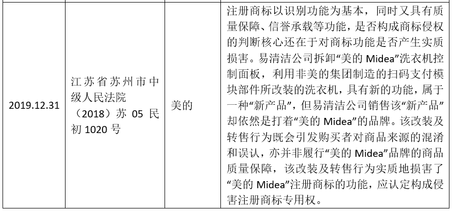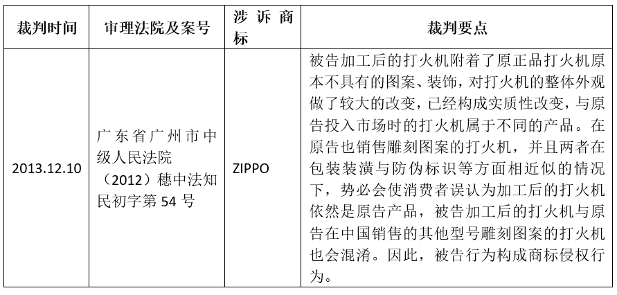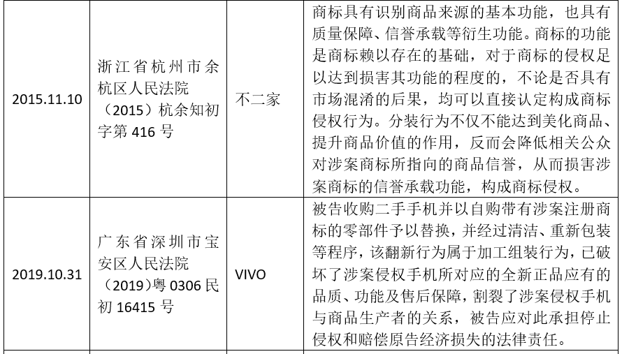 在最高人民法院就上述案件再審作出裁定前,已存在多份判決將此類行為認定為構成商標侵權的案例,部分還入選當地法院的年度十大知識產權保護案件。如,廣東省廣州市中級人民法院審結的“ZIPPO打火機”案【(2012)穗中法知民初字第54號】;浙江省杭州市余杭區人民法院審結的“不二家糖果”案【(2015)杭余知初字第416號】,該案入選“2015年浙江法院十大知識產權保護案件”;廣東省深圳市寶安區人民法院審結的“VIVO手機”案【(2019)粵0306民初16415號】;江蘇省蘇州市中級人民法院審結的“美的洗衣機”案【(2018)蘇05民初1020號】等。以下通過列表的形式展示相關參考信息: