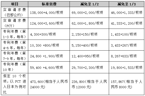 對于在2019年4月1日之后提出實審請求的日本發明專利申請,其實審請求費和專利年費將按照下表內容進行減免: