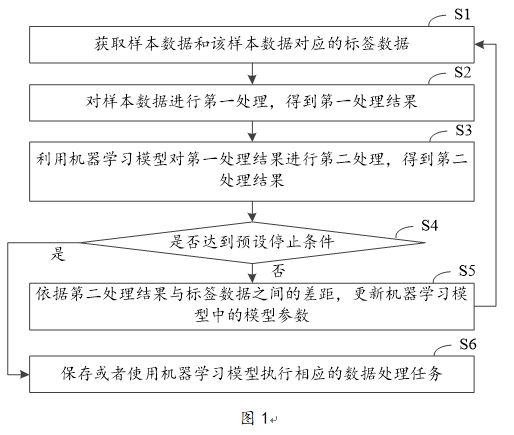 步驟4,判斷是否達到預設停止條件,若否,則依據所述第二處理結果和所述標簽數據之間的差距,更新機器學習模型中的模型參數,并繼續執行所述步驟1至所述步驟4;若是,則保存或者使用所述機器學習模型執行相應的數據處理任務。