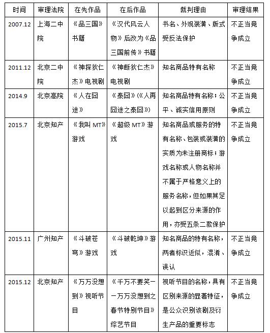 如上所述,這種沖突類型實際上是比較典型的仿冒之訴。這種沖突發(fā)生在同類作品之間,與發(fā)生在同類商品或服務(wù)之間,并沒有實質(zhì)上的區(qū)別。此類案件審理的難點在于,能否把原告主張的影視名稱、游戲名稱等作品名稱作為反不正當(dāng)競爭法第五條第二項下的“知名商品的特有名稱”進行保護。在武漢華旗訴光線傳媒、徐崢《泰囧》一案中,法院同時適用了反法第五條第二項和第二條公平、誠實信用原則條款,以第二條原則性條款來補強適用第五條第二項稍顯牽強的缺憾;在北京知識產(chǎn)權(quán)法院審理的《我叫MT》一案中,法院也注意到“游戲名稱或人物名稱并不屬于嚴(yán)格意義上的服務(wù)名稱”,但認(rèn)為可以將“知名商品/服務(wù)名稱”擴大到游戲名稱、人物名稱,條件是“其足以起到區(qū)分來源的作用”。本文附表四總結(jié)了此類案件的審理情況,供讀者參考。