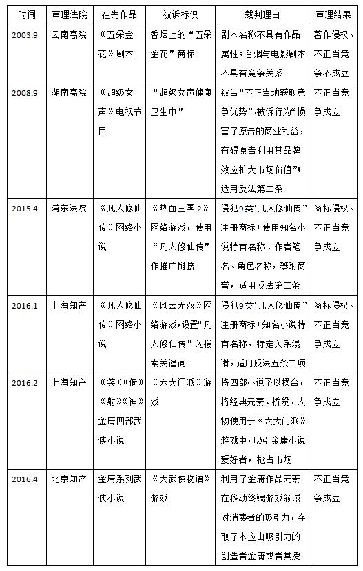 這種類型的案件目前數(shù)量不多,但可以預(yù)見,將文化轉(zhuǎn)化為商業(yè)力量已經(jīng)是文化傳媒產(chǎn)業(yè)的大趨勢,隨之而來的類似案件將會急劇增加。從已決的案件結(jié)果看,對于在先作品名稱的商業(yè)化利用問題,司法判決已經(jīng)從不保護逐漸轉(zhuǎn)向保護;在法律適用方面,較多的案例引用反不正當(dāng)競爭法第二條的一般條款進行判決,也存在個案適用反不正當(dāng)競爭法第五條第二項。筆者認(rèn)為,將他人在先作品名稱作為自身商品或服務(wù)的標(biāo)識使用,確實可能會使人誤認(rèn)為該商品或服務(wù)與作品權(quán)利人之間存在授權(quán)許可、合作等特定關(guān)系,但這種認(rèn)知不同于商品或服務(wù)來源的混淆,與反法仿冒意義上的混淆、誤認(rèn)還是存在明顯區(qū)別。何況,反法第五條的保護范圍通常是在類似商品或服務(wù)的范圍之內(nèi),將這一條款擴大適用到作品的衍生商品或服務(wù)范圍,稍顯牽強。因此,在反法第五條修改之前,適用第二條一般性條款似乎更為適當(dāng)。本文附表五總結(jié)了此類案件的審理情況,供讀者參考。