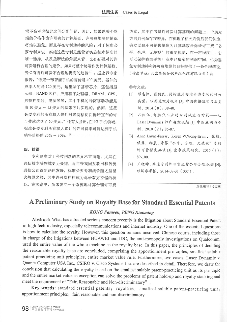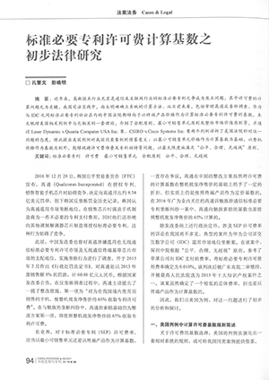 集佳文章《標(biāo)準(zhǔn)必要專(zhuān)利許可費(fèi)計(jì)算基數(shù)之初步法律研究》在《中國(guó)發(fā)明與專(zhuān)利》發(fā)表