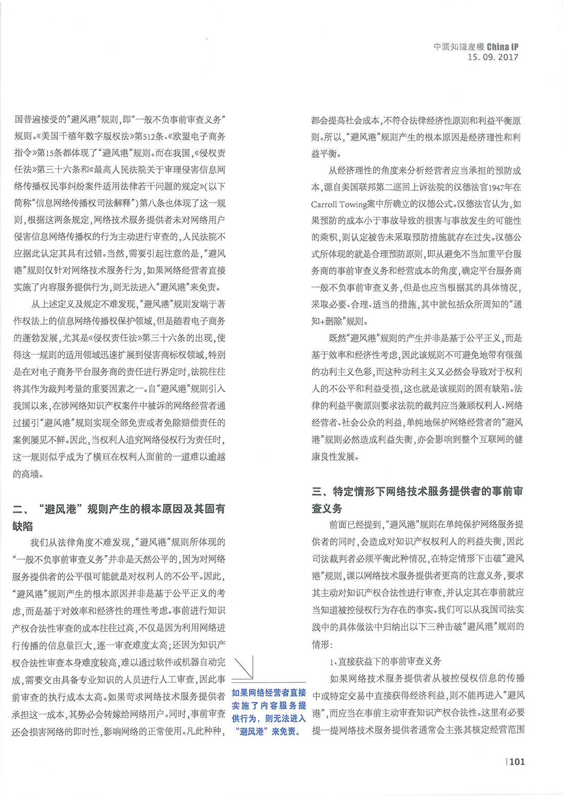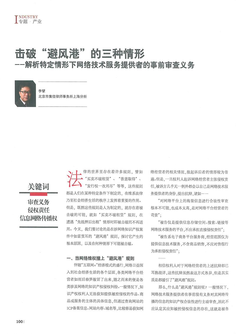 集佳文章《擊破“避風(fēng)港”的三種情形——解析特定情形下網(wǎng)絡(luò)技術(shù)服務(wù)提供者的事前審查義務(wù)》在《中國知識產(chǎn)權(quán)》發(fā)表