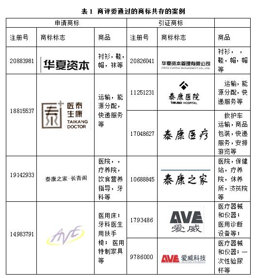那么究竟多么近似的商標可以被商評委準予共存呢?為了給大家一個感性認識,筆者舉幾個成功共存的例子供大家參考(請見表1)。