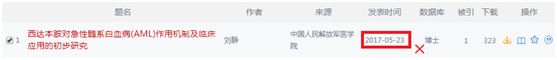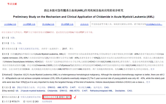 CNKI網(wǎng)頁顯示的“發(fā)表時(shí)間”并非該論文的公開日。實(shí)際上,CNKI只是將論文首頁記載的日期(答辯日期)登記為“發(fā)表時(shí)間”,并錄入數(shù)據(jù)庫中,但并不對(duì)此進(jìn)行核實(shí)。論文首頁記載的答辯日期類似于送審日期(或收稿日期)。任何一篇文章或論文在網(wǎng)絡(luò)刊物或期刊雜志上公開發(fā)表之前,都會(huì)送審,因而都有一個(gè)送審版本,該送審版本可能是電子版或紙本,該送審版本都需要發(fā)送或遞交給網(wǎng)絡(luò)刊物或期刊雜志聘請(qǐng)的專家進(jìn)行審稿,審稿通過后才能公開發(fā)表。許多網(wǎng)絡(luò)刊物或期刊雜志都會(huì)在發(fā)表的文章中記載送審日期或收稿日期。這些送審日期與發(fā)行日期是不同的日期。例如,“DCAG聯(lián)合HLA不相合的干細(xì)胞輸注治療老年初發(fā)急性髓系白血病的療效觀察”這篇論文的送審日期是2014年4月9日,但是其發(fā)行日期是2015年3月。因此,通常送審日期要早于發(fā)行日期。