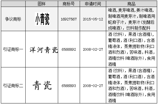 原告江蘇洋河酒廠股份有限公司(以下簡(jiǎn)稱“洋河酒廠”)早在2008年,就在第33類“酒(飲料)”等商品上注冊(cè)了“洋河青瓷”、“青瓷”商標(biāo),并且早在其注冊(cè)之前,自1999年開始就在“白酒”商品上開始使用“青瓷”商標(biāo)。但是,在2015年,英國(guó)凱撒啤酒有限公司在第32類“啤酒”等商品上注冊(cè)了“小青瓷”商標(biāo)。因此,洋河酒廠對(duì)該商標(biāo)提出了異議,異議的理由即為訴爭(zhēng)商標(biāo)與引證商標(biāo)構(gòu)成類似商品上的近似商標(biāo)。