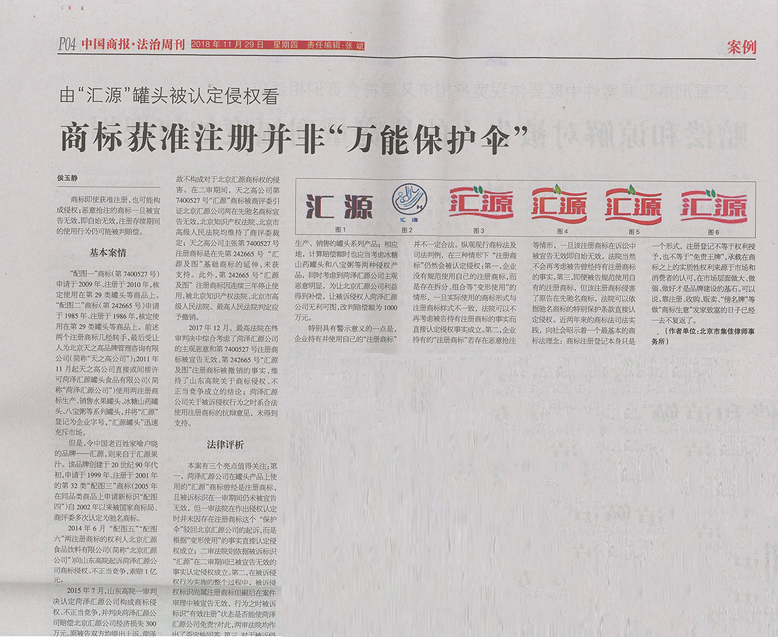 集佳文章《由“匯源”罐頭被認(rèn)定侵權(quán)看商標(biāo)獲準(zhǔn)注冊(cè)并非“萬(wàn)能保護(hù)傘”》在《中國(guó)商報(bào)》發(fā)表