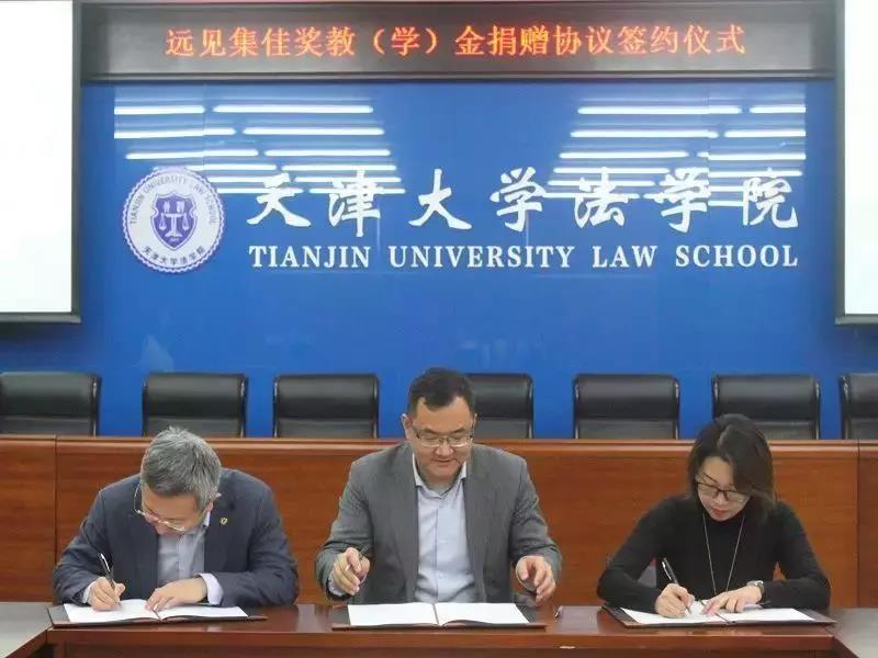 2018年12月29日,“天津大學(xué)法學(xué)院遠(yuǎn)見集佳獎(jiǎng)教(學(xué))金”捐贈協(xié)議簽訂儀式在津舉行。中關(guān)村遠(yuǎn)見知識產(chǎn)權(quán)創(chuàng)新研究院理事長高巍,北京市集佳律師事務(wù)所主任李永波律師,天津大學(xué)校友與基金事務(wù)處處長潘峰、任杰老師和天津大學(xué)法學(xué)院院長孫佑海,副書記、副院長李明,郭貴雨老師等出席。