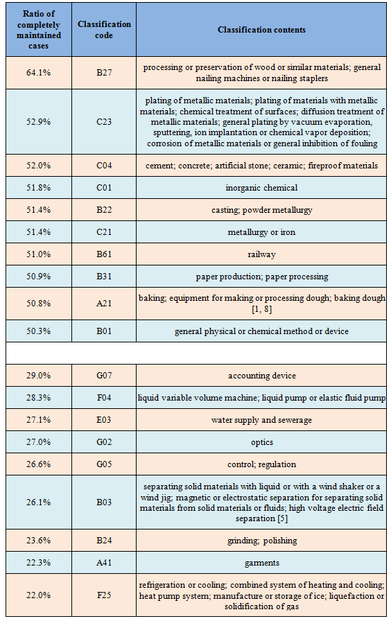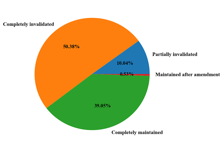 On the whole, the invalidation cases in such basic fields as inorganic materials (e.g., wood, metal, and cement) and processing thereof (e.g. plating, and surface treatment) have a relatively high ratio of completely maintained cases. The invalidation cases in such specific application field such as optoelectronics have a relatively low ratio of completely maintained cases.