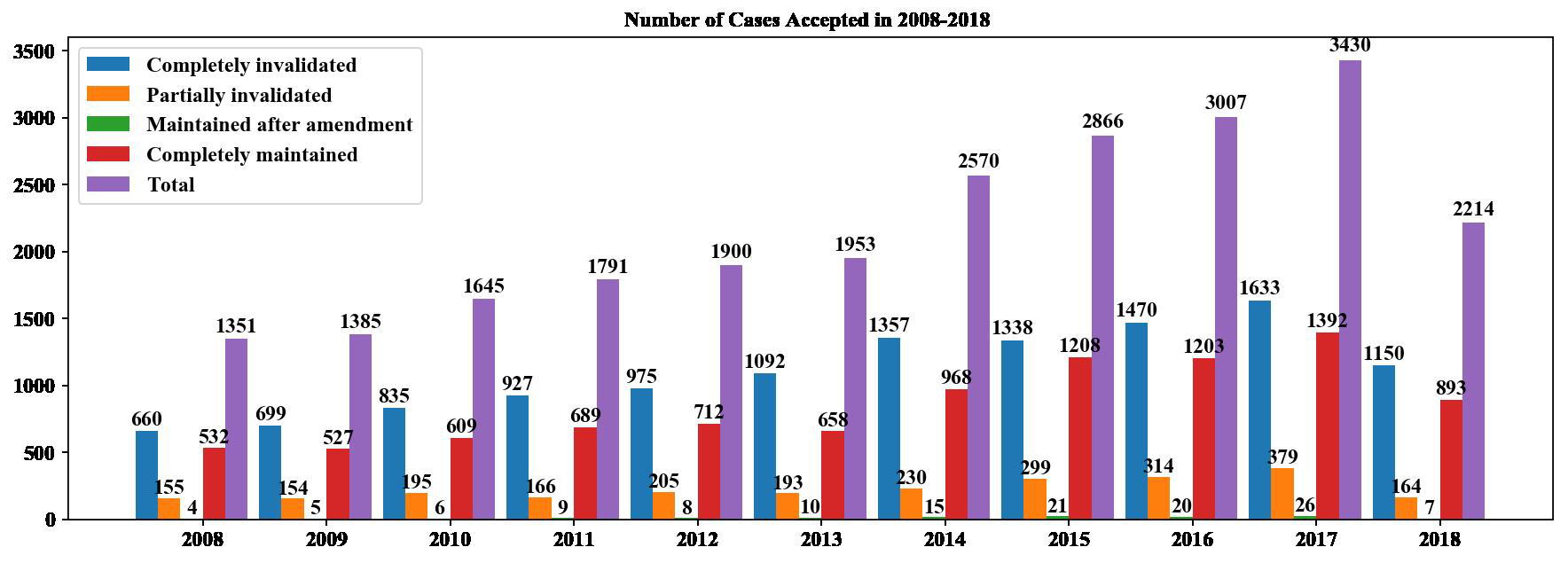 It should be noted that it seems the number of cases in 2018 is relatively less, but it cannot be simply deemed that the number of the requests for invalidation is reduced in 2018 since the possible reason is that there are many cases accepted in 2018 that are not yet closed.