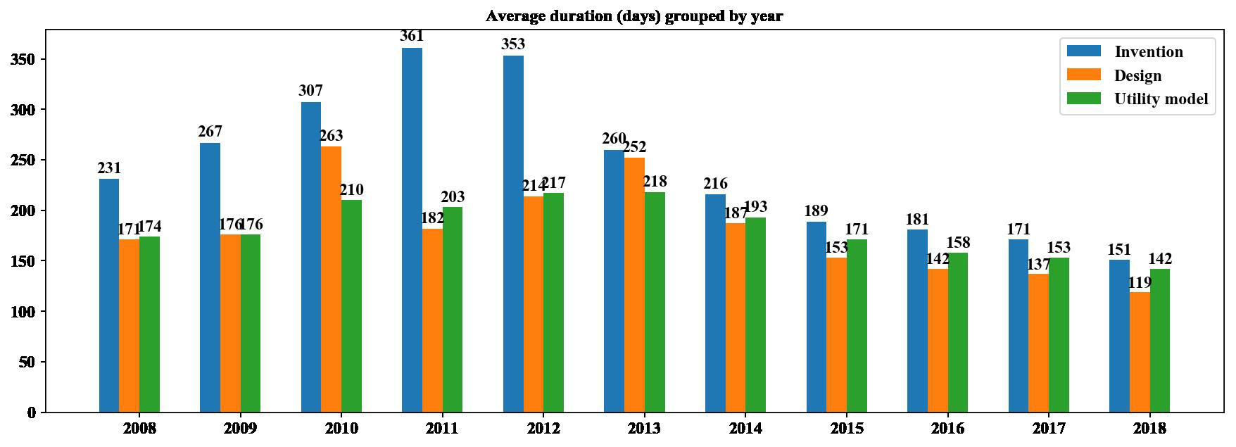(2) Regardless of the year, duration of invention cases is longer than those of the cases of utility model and design; generally, duration of design cases is the shortest.