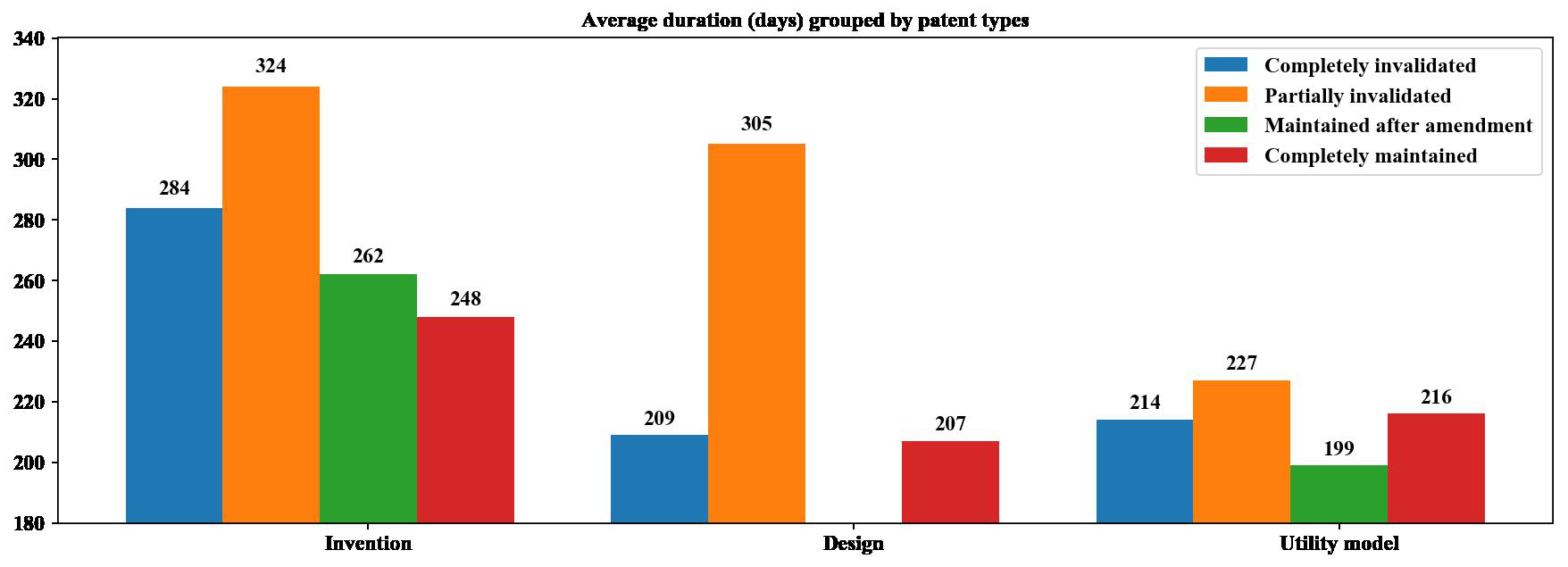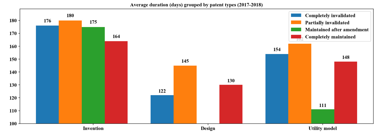 The above figure shows the average duration (days) of patent invalidation cases grouped by patent types. On the whole, average duration of invalidation cases of invention patent is longer than that of design patent and utility model, wherein making the decision of partially invalidation is the most time-consuming in each patent type. The possible reason is that, compared with the cases of completely maintained and those of completely invalidation, the cases of partially maintained may be much more complicated so that it takes more time to make the decisions.