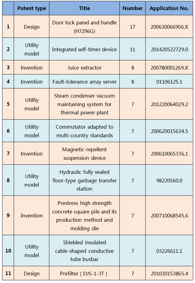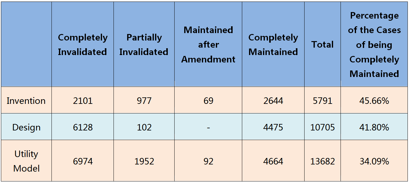 Generally speaking, the times of filing request of invalidation against a patent is in positive proportion with the patent stability (an unstable patent would not be subject to invalidation for many times since it could be invalidated easily) and the patent value (a low-value patent is not worthy of the costs consumed by petitioners). In the patents listed in the above table, the ratio of utility model and that of design are not smaller than the ratio of invention. Accordingly, the patents for utility model and design drafted at a high level can also have value not lower than the patents for invention.