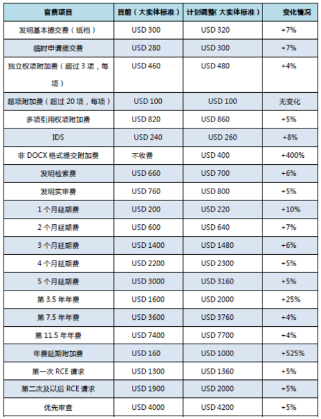 本次官費調整計劃基本涵蓋各項官費,包括2018年1月實施的新官費表中未調整的年費、OA答復延期費等,最大的調整包括專利訴訟請求費上調25%,年費遲交滯納金上調525%,外觀加速審查費上調122%,新增非DOCX文件的提交費。