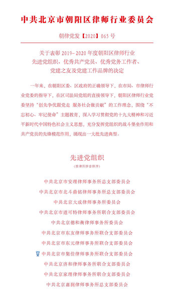7月1日,在慶祝中國共產(chǎn)黨成立99周年之際,中共北京市朝陽區(qū)律師行業(yè)委員會下發(fā)文件表彰2019-2020年度朝陽區(qū)律師行業(yè)先進黨組織及個人,集佳律所黨支部被授予“先進黨組織”光榮稱號。