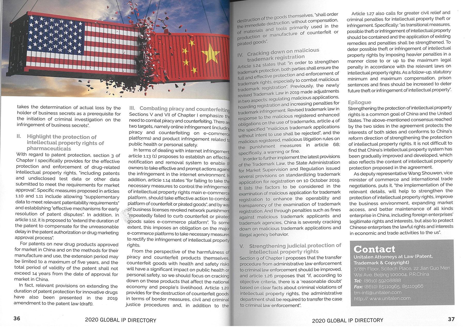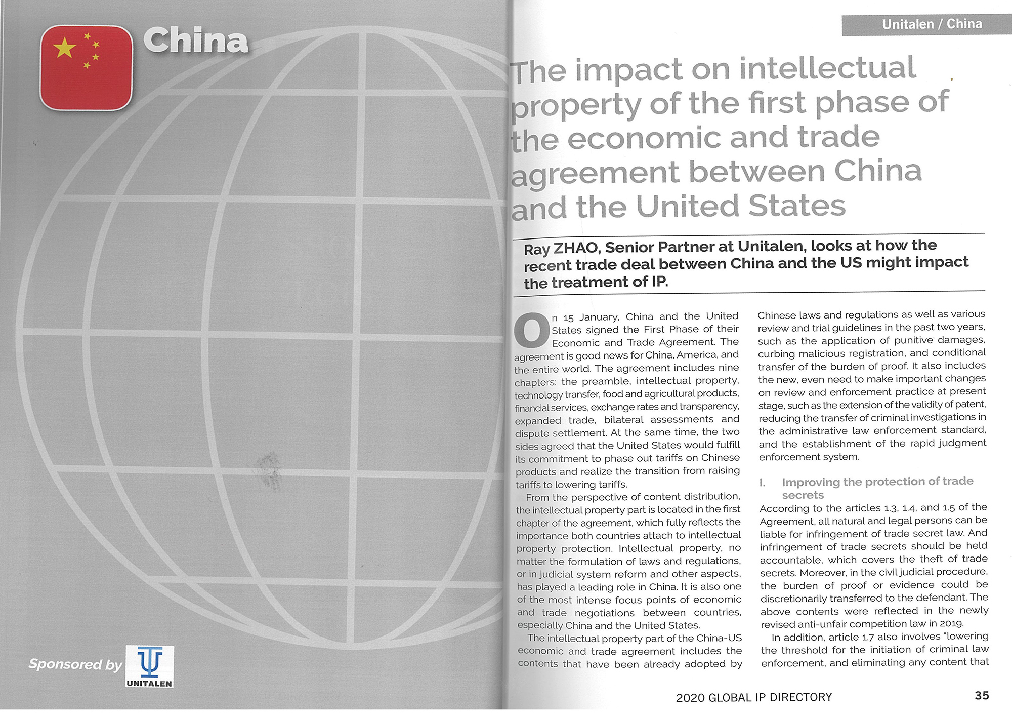 集佳合伙人趙雷律師文章《The impact on intellectual property of the first phase of the economic and trade agreement between China and the United States》在《2020 GLOBAL IP DIRECTORY》發表