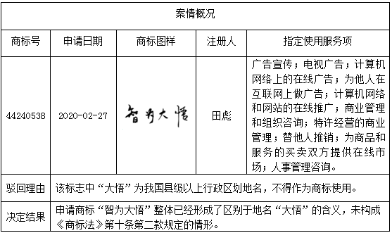 從“智為大悟”商標駁回復審案看商標中包含有地名的判斷標準