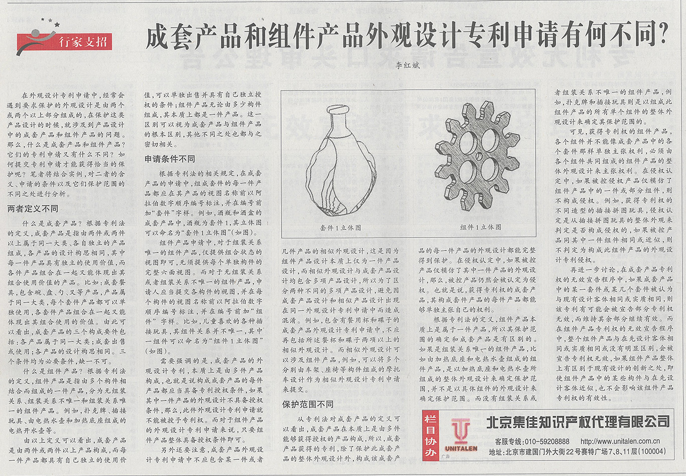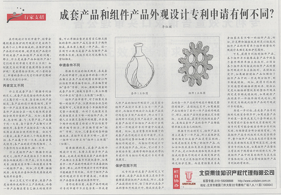 集佳文章《成套產品和組件產品外觀設計專利申請有何不同?》在《中國知識產權報》發表