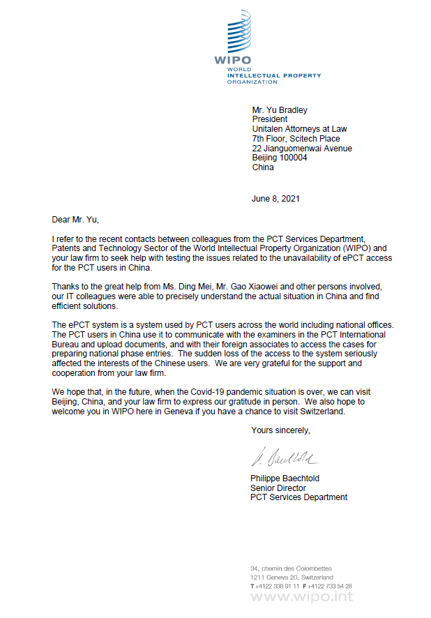 近日,世界知識產(chǎn)權組織(WIPO)國際局PCT服務部高級司長Philippe Baechtold向集佳合伙人會議主席于澤輝所長發(fā)來感謝信,對協(xié)助PCT服務部完美解決了WIPO ePCT系統(tǒng)在中國使用問題的集佳工作人員表示衷心感謝!