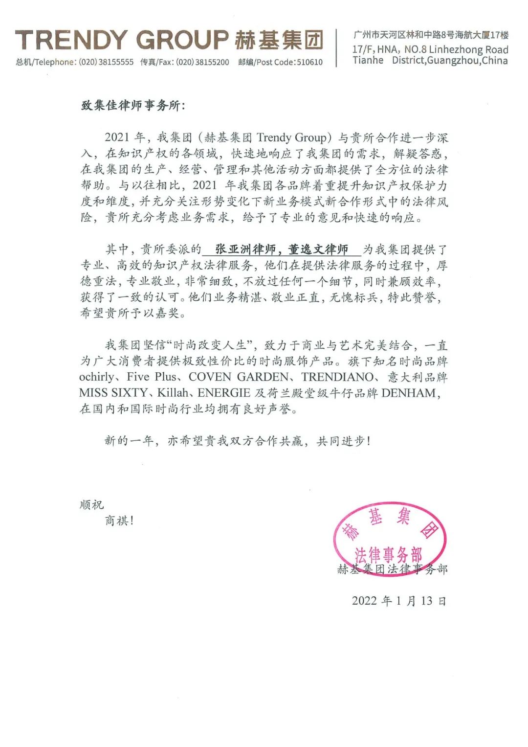 新春佳節(jié)將至,集佳收到赫基集團(tuán)發(fā)來(lái)的表?yè)P(yáng)信,贊譽(yù)集佳律師事務(wù)所張亞洲律師和董逸文律師專業(yè)、高效的知識(shí)產(chǎn)權(quán)法律服務(wù)。