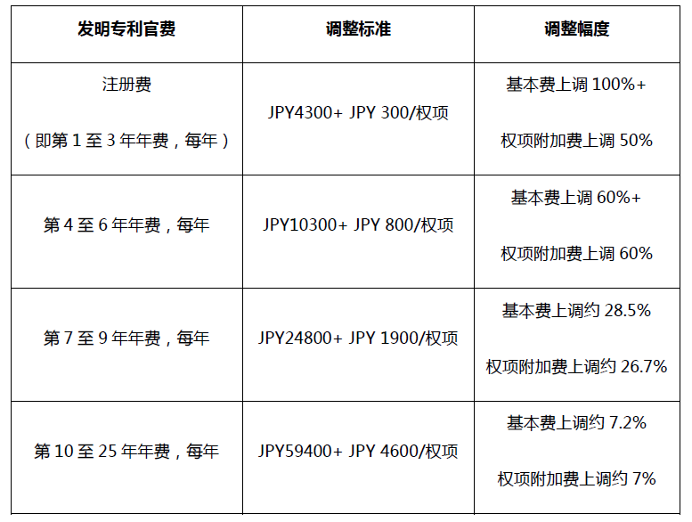 日本專利局每2-3年會(huì)對(duì)官費(fèi)進(jìn)行一次調(diào)整,并在每年4月1日生效實(shí)施。本次將于2022年4月1日生效實(shí)施的官費(fèi)主要是發(fā)明專利的注冊費(fèi)和年費(fèi),具體調(diào)整如下: