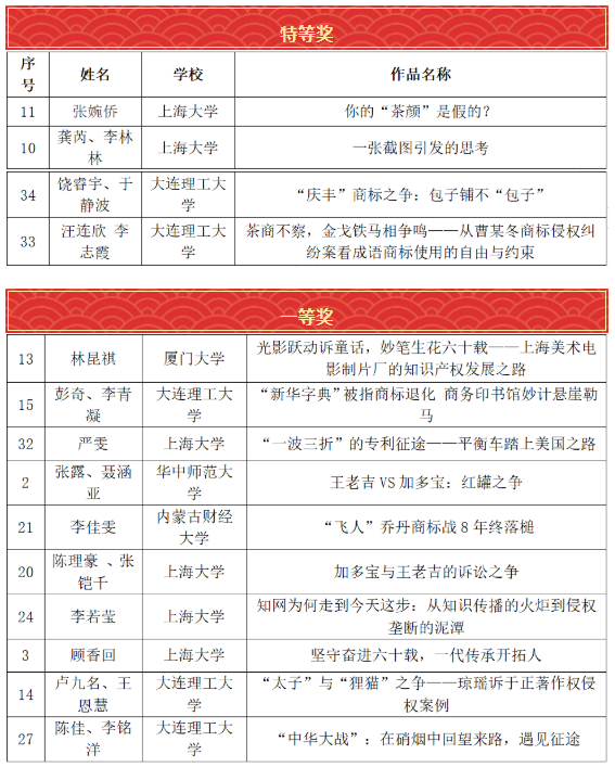 由集佳律所上海分所贊助、上海大學法學院/知識產權學院主辦的首屆“知識產權?中國故事”撰寫比賽,經過參賽作品展示、入圍初選、專家評審以及決賽答辯等環節的激烈角逐,于2022年3月26日在上海大學圓滿落下帷幕,來自上海大學、大連理工大學、西南政法大學、上海杉達學院、廈門大學、內蒙古財經大學、景德鎮陶瓷大學和華中師范大學的35組本科生及研究生摘奪了35個專業獎項。
