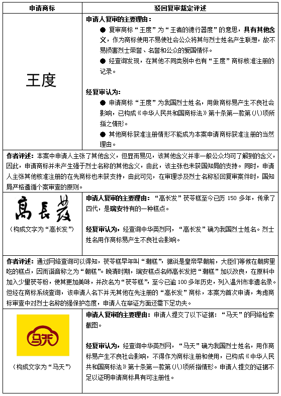 但是,只要與烈士名稱相同,則無法注冊為商標使用嗎?當然不是,以下將分別分析通過駁回復審予以駁回,以及通過駁回復審準予注冊兩種情況,來明晰如何克服與烈士名稱沖突的商標申請案件。