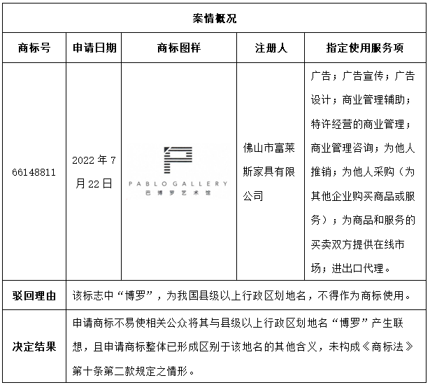 首先,“巴博羅”是佛山市富萊斯家具有限公司旗下的家具品牌,查閱佛山市富萊斯家具有限公司旗下的商標注冊情況可知,其最早于2011年就提交了“巴博羅 PABLO CASA”商標注冊申請,隨后又申請注冊了多件“巴博羅 PABLO CASA”商標,能夠證明佛山市富萊斯家具有限公司使用“巴博羅 PABLO CASA”商標已經達十幾年之久。本案中申請商標漢字為“巴博羅藝術館”,其屬于在“巴博羅”基礎上延伸的品牌,消費者基于對“巴博羅”品牌的認知,也會將“巴博羅藝術館”視為是“巴博羅”的系列商標。雖然“博羅”是隸屬于廣東省惠州市轄區下的一個縣級城市名稱,但其作為縣級城市名稱并不被廣大消費者所熟知,當普通消費者看到“博羅”二字時,并不太可能將其誤認是行政區劃名稱。可見,“博羅”與“巴博羅藝術館”是能夠被區分開來,消費者不會將二者混同。