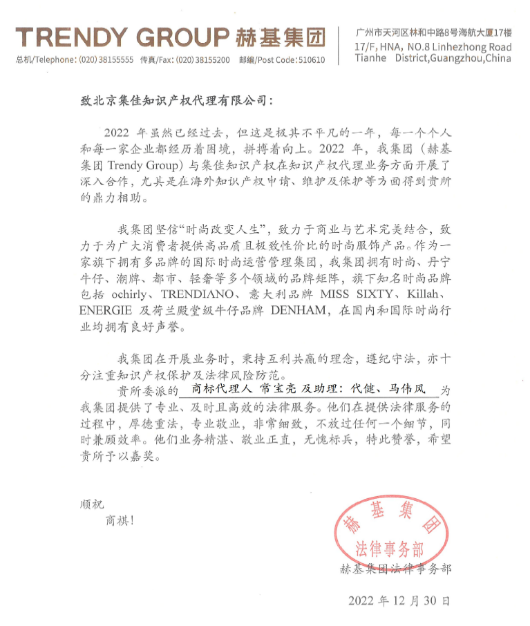 新年伊始,集佳收到來自客戶赫基集團的暖心表揚信,信中對集佳在知識產權保護和維權、廣告合規、不正當競爭等領域的優質服務、精湛業務給予高度認可,并對張亞洲、李用航、董逸文、常寶亮、代健、馬偉風等集佳專業人員認真負責的工作態度致以高度贊譽,稱贊他們在提供法律服務的過程中,厚德重法,專業高效,敬業正直,無愧標兵!