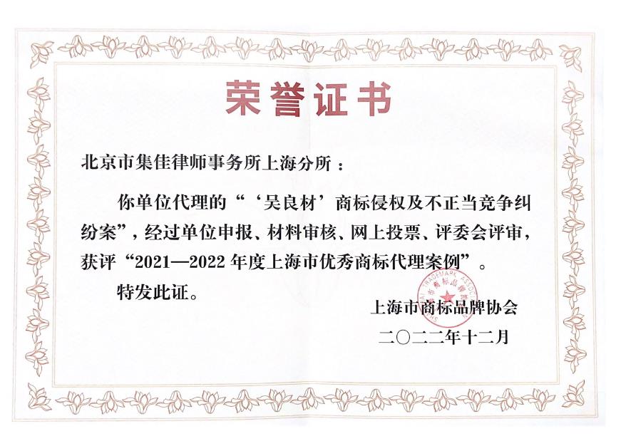 集佳上海分所代理的“吳良材”商標侵權及不正當競爭糾紛案被評為“2021-2022年度上海市優秀商標代理案例”。“吳良材”案歷經一審、二審、再審審查、抗訴審查程序,耗時六年,終于落下了帷幕。本案司法機關所遵循的“尊重歷史、禁止混淆、誠實信用、利益平衡”的老字號知識產權司法保護理念,既尊重歷史所形成的事實,為被告保留相應發展空間,又依據商標法的規定合理保護注冊商標專用權,禁止混淆性使用,具有相當的典型意義。