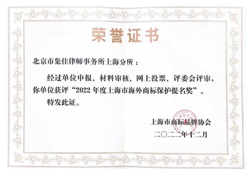 同時,集佳上海分所獲評“2022年度上海市海外商標保護提名獎”,以表彰集佳上海分所在幫助中國企事業單位處理國際商標品牌事務上取得的優異成績。隨著中國經濟的發展和企業的成長,集佳上海分所依托總部的支持,長期致力于為眾多中國企業處理海外商標注冊、國際保護和品牌運營等法律事務,以實際行動助力中國市場主體走向海外市場并應對錯綜復雜的國際知識產權法律環境。多年來,集佳馬德里國際注冊商標的代理量一直穩居行業前列。