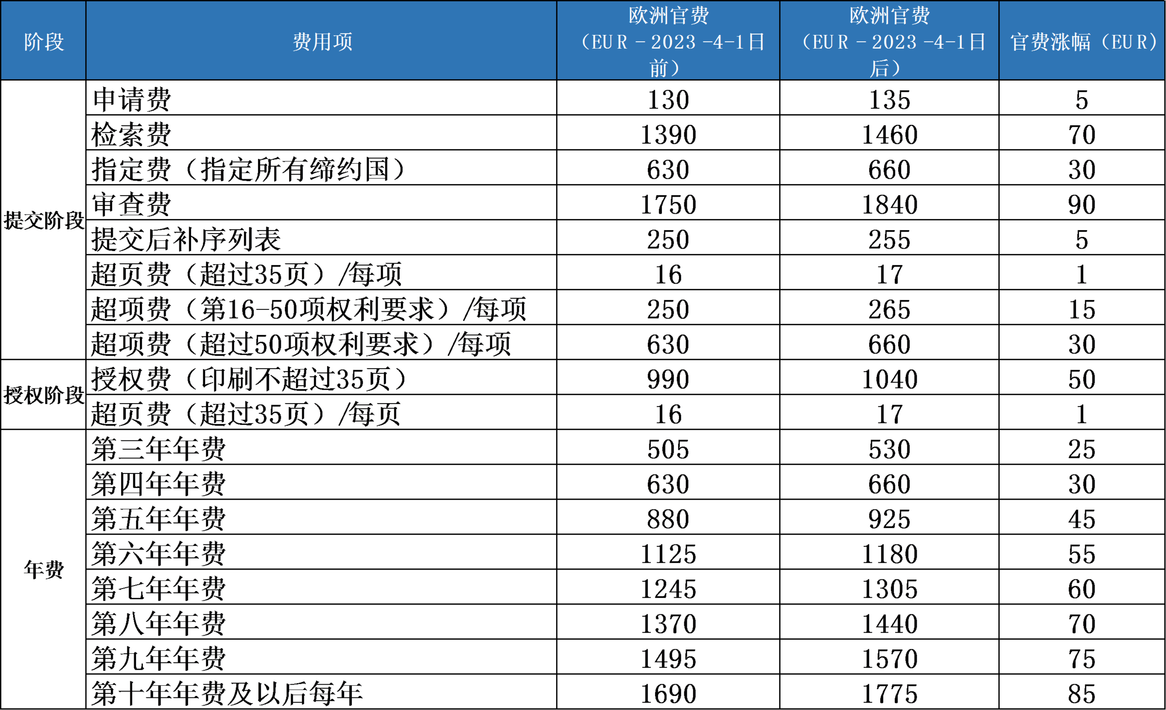 歐洲專利局(EPO)將于2023年4月1日起上調(diào)官費,幅度為5%左右,具體如下: