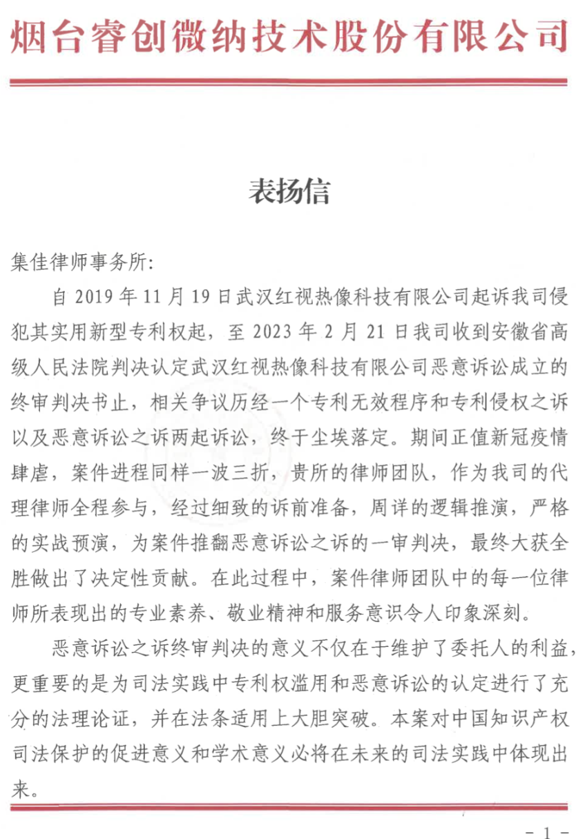 After losing the court case in the first trial, Unitalen team summed up the experience in a timely manner, took Wuhan Hongshi's act of maliciously applying for a patent while knowing perfectly well that it had disclosed the technical solution beforehand as a breakthrough point to re-collect the evidence. Unitalen submitted additional evidence to the court to prove the cooperation relationship between Raytron Group and Wuhan Hongshi in the early years and to prove that Wuhan Hongshi sold the allegedly infringing products concerned as an agent, and added evidence that Wuhan Hongshi hired a professional patent agency to apply for dozens of patents to prove that Wuhan Hongshi had subjective malice of abusing the right to sue for the reason that it knew very well the conditions for granting patent rights and the substantive defects of the patent concerned, but still applied for several patents fraudulently and filed the infringement lawsuits based on the patents. Meanwhile, Unitalen carried out legal research and searched for similar cases actively, conducted in-depth research and analysis on the legal relationship and practical precedents of malicious filing of an intellectual property lawsuit, and composed special research articles and a similar case search report.