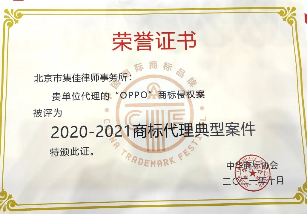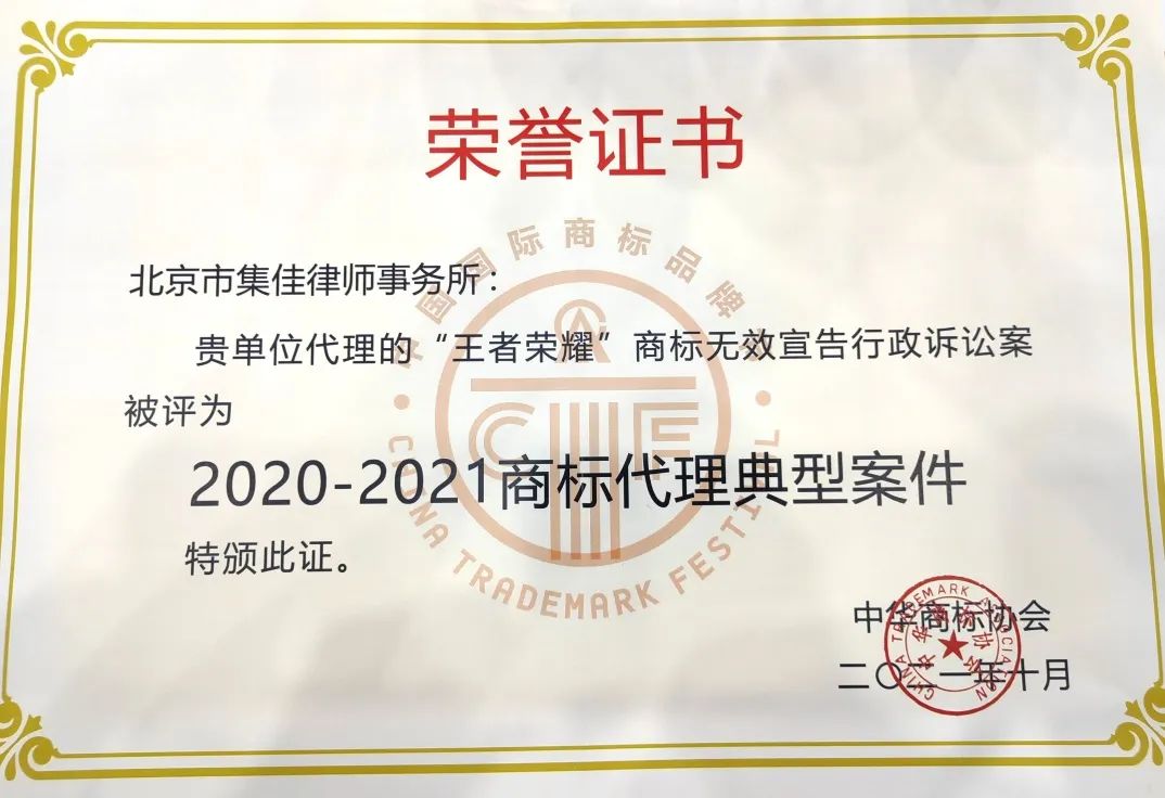 6月17日,第十三屆中國國際商標品牌節(jié)正式拉開帷幕,各項活動火熱進行。在“商標典型案例評析論壇”上,集佳律師事務所代理的“第33類‘王者榮耀’無效宣告行政訴訟案”和“OPPO侵權(quán)案”因其體現(xiàn)出的創(chuàng)新性、實效性、典型性和影響力,在眾多案例中脫穎而出,雙雙入選“2020-2021商標代理典型案件”。