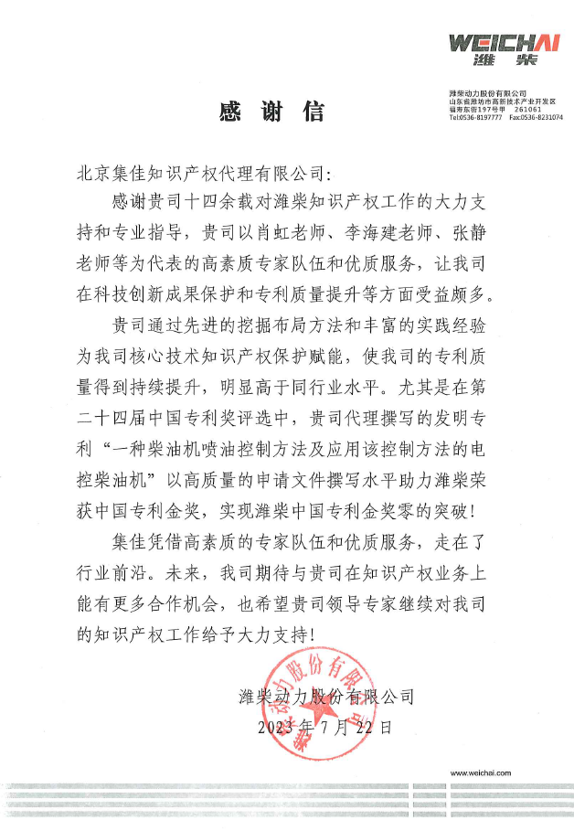 濰柴動力在感謝信中表示,集佳十四余年來對濰柴知識產(chǎn)權(quán)工作的大力支持和專業(yè)指導(dǎo),尤其是集佳肖虹、李海建、張靜等高素質(zhì)專家隊伍的優(yōu)質(zhì)服務(wù),讓濰柴動力在科技創(chuàng)新成果保護(hù)和專利質(zhì)量提升等方面受益頗多,特別是集佳以高質(zhì)量的申請文件撰寫水平,助力濰柴發(fā)明專利獲得中國專利金獎,使濰柴實(shí)現(xiàn)了中國專利金獎零的突破,期待雙方未來在知識產(chǎn)權(quán)業(yè)務(wù)上開展更多合作!
