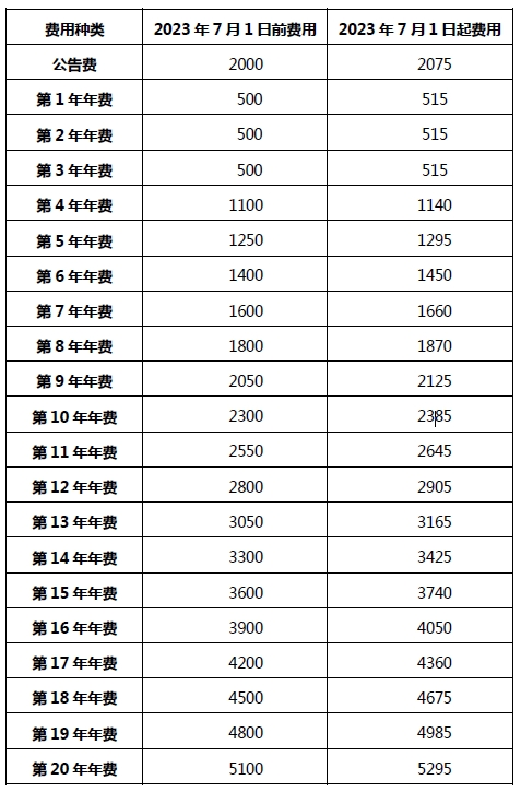 *續展費的調整適用于2023年9月30日之后到期的費用。這意味著在2023年9月30日之前到期的續展費仍按2023年7月1日之前的標準繳納。如果逾期支付費用,將收取20%的滯納金。