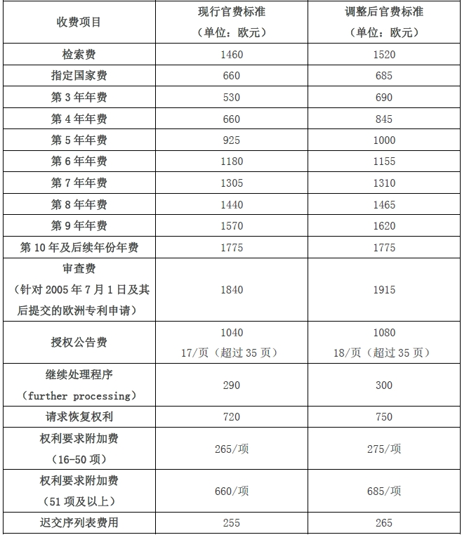 根據2023年12月14日歐洲專利組織行政理事會關于修改《歐洲專利公約實施細則》和《關于費用的實施細則》的決定,自2024年4月1日起,歐專局將提高其官費收費標準。從官費調整的增幅來看,第三年和第四年的維持費官費增幅較大(約上漲30%),具體官費上調信息詳見下表。