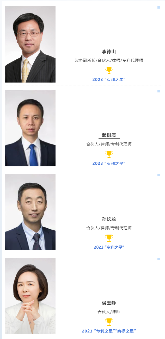 同時,李德山副所長、武樹辰律師、孫長龍律師和侯玉靜律師因其在各自領域的卓越實力和杰出表現,分別獲評2023 IP Stars“專利之星”“商標之星”美譽。